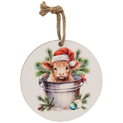 The Baby Santa Highland in a Bucket Ornament is a decorative hanger with a jute twine loop for easy display. Crafted from wood, the round ornament shows a whimsical baby Highland cow sitting in a silver bucket. The darling design features a white background, and green pine branches accent the scene. The cow wears a red and white Santa hat, and one blue and one pink ornament sit near the bucket. Measures 5” in diameter by .13” deep.