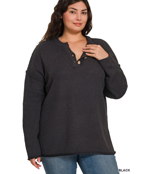 4 BUTTONS HENLEY NECKLINE BASIC SWEATER
