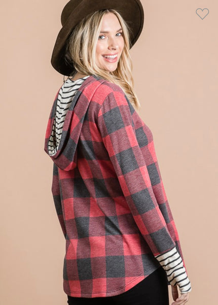 Plaid drawstring hoodie, with thumb holes in the sleeve. 62% polyester 33% rayon and 5% spandex.