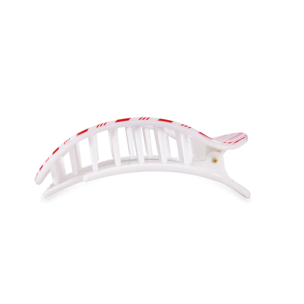 Lay flat and relax with the new TELETIES Candy Cane Crush Medium Flat Round Hair Clip in Red and White Stripes. This hair clip is designed to allow you to lay back flat, do yoga, or sit comfortably in a seat with a headrest, and it is made with the same material that is nearly unbreakable.