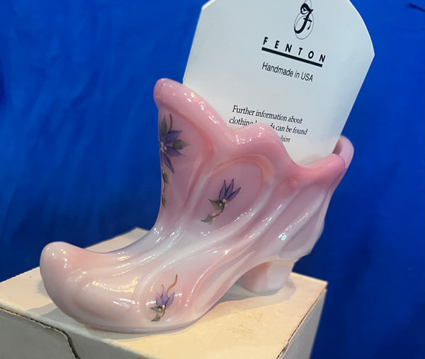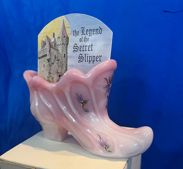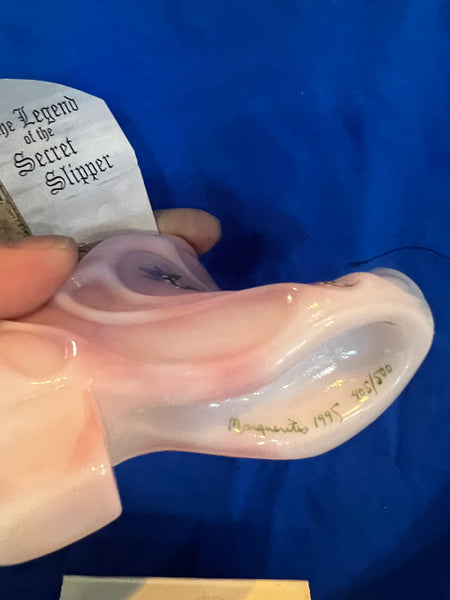 DESIGNED BY MARGUERITE & BARB IN 1995. THIS IS FENTON GLASS PRODUCED IN WEST VIRGINIA. EACH SLIPPER IS SIGNED BY MARGUERITE AND NUMBERED. THERE WHERE ONLY 500 MADE.