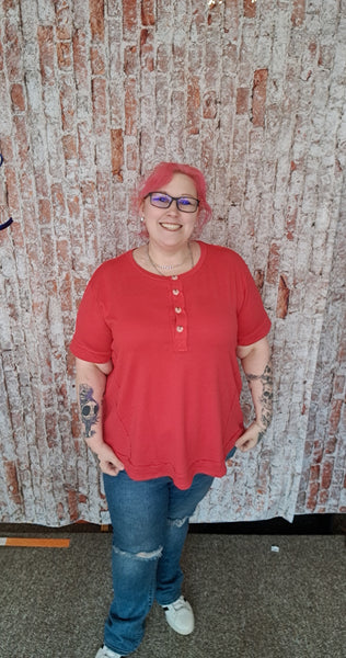 Add a unique twist to your casual wardrobe with this terry top, featuring intricate details all over the fabric for added texture and style. The front button details enhance its charming design, making it perfect for relaxed, yet elevated looks. soft and breathable, this top offers comfort and a distinctive touch, ideal for everyday! Knit, stretchy.