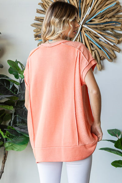A SOLID TERRY TOP FEATURING A HI LOW DETAIL ON HEM, ROUND NECK, TEXTURED, EXPOSED STITCH, RELAX FIT, AND SHORT SLEEVES.