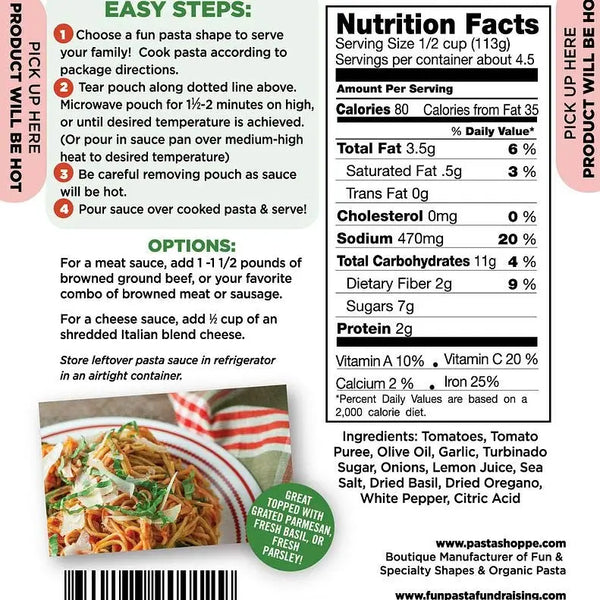 This will be your favorite Red Pasta Sauce! We have created "Pastably the BEST sauce EVER!" Your family will love this classic red pasta sauce over any of our shapes. It's the perfect combination of fresh tomatoes, herbs, and spices with a touch of sweetness. To jazz it up you can add ground beef or sausage to make it a meat sauce or even cheese for a cheesy tomato sauce! The pouch is microwavable for ease and convenience! 18 oz microwavable pouch of red sauce! The Pasta Shoppe has been creating fun pasta and Italian food for decades! Whether you are shopping for holiday, Christmas, or organic items, or fun gifts for your store, you’ll find lots of options with our Pastabilities brand. Don’t miss our soup, pasta sauce, mac and cheese or other unique goodies – are you ready, spaghetti?